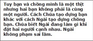 Tuy bạn và chồng mình là một thịt nhưng hai bạn không phải là cùng một người. Cách Chúa tạo dựng bạn khác với cách Ngài tạo dựng chồng bạn. Chúa biết Ngài đang làm gì khi đặt hai người cạnh nhau. Ngài không phạm sai lầm.